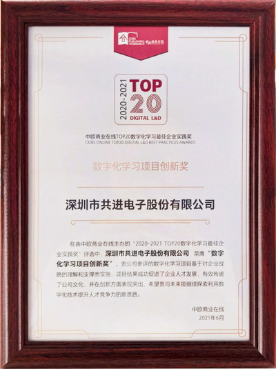 In the activity of deciding “2020-2021 TOP20 E-Learning Best Enterprise Practice Award” held by CEIBS Business Online in Beijing, the E-Learning project offered by Gongjin Electronics won “E-Learning Project Innovation Award” on Jun. 25th. It was a project based on the understanding and support of the enterprise strategy. The project achievements successfully promoted enterprise talent development, effectively spread company cultures, had outstanding performance in innovation and provided new thoughts for increasing talent competitiveness through digital technology.