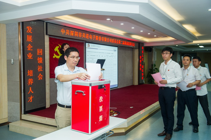 5月22日下午,中共深圳市共进电子股份有限公司委员会根据《中国共产党章程》和《中国共产党基层组织选举工作暂行条例》的有关规定,结合党委实际,在蛇口总部3A会议厅召开了共进党委第二届换届选举大会,公司近百名党员出席选举大会,上海共进、太仓同维支部党员列席会议。