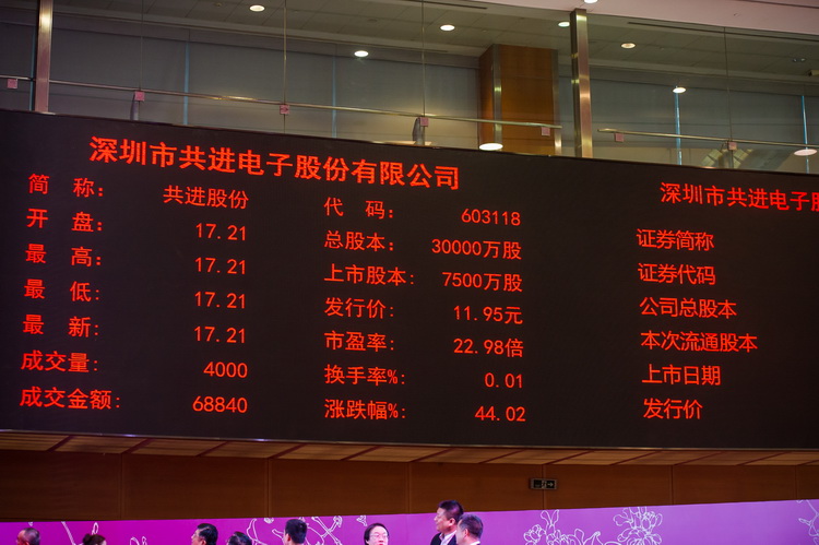 2月25日,正值开工大吉,深圳市共进电子股份有限公司(下简称共进或共进股份)7500万股A股股票在上交所上市交易,证券简称为“共进股份”,证券代码为“603118”。公司A股股本为30000万股。